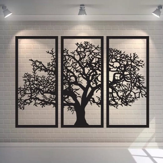 Quadro Decorativo Árvore da Vida 3 Peças C/ Dupla Face 3M em MDF Vazado de 3mm Preto